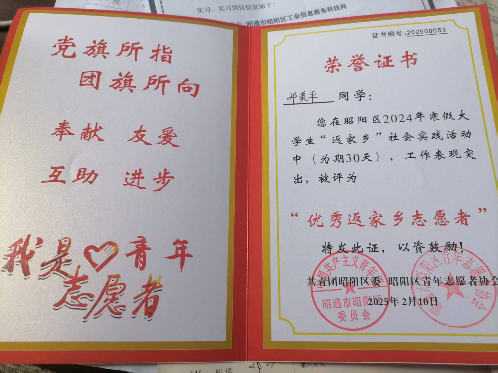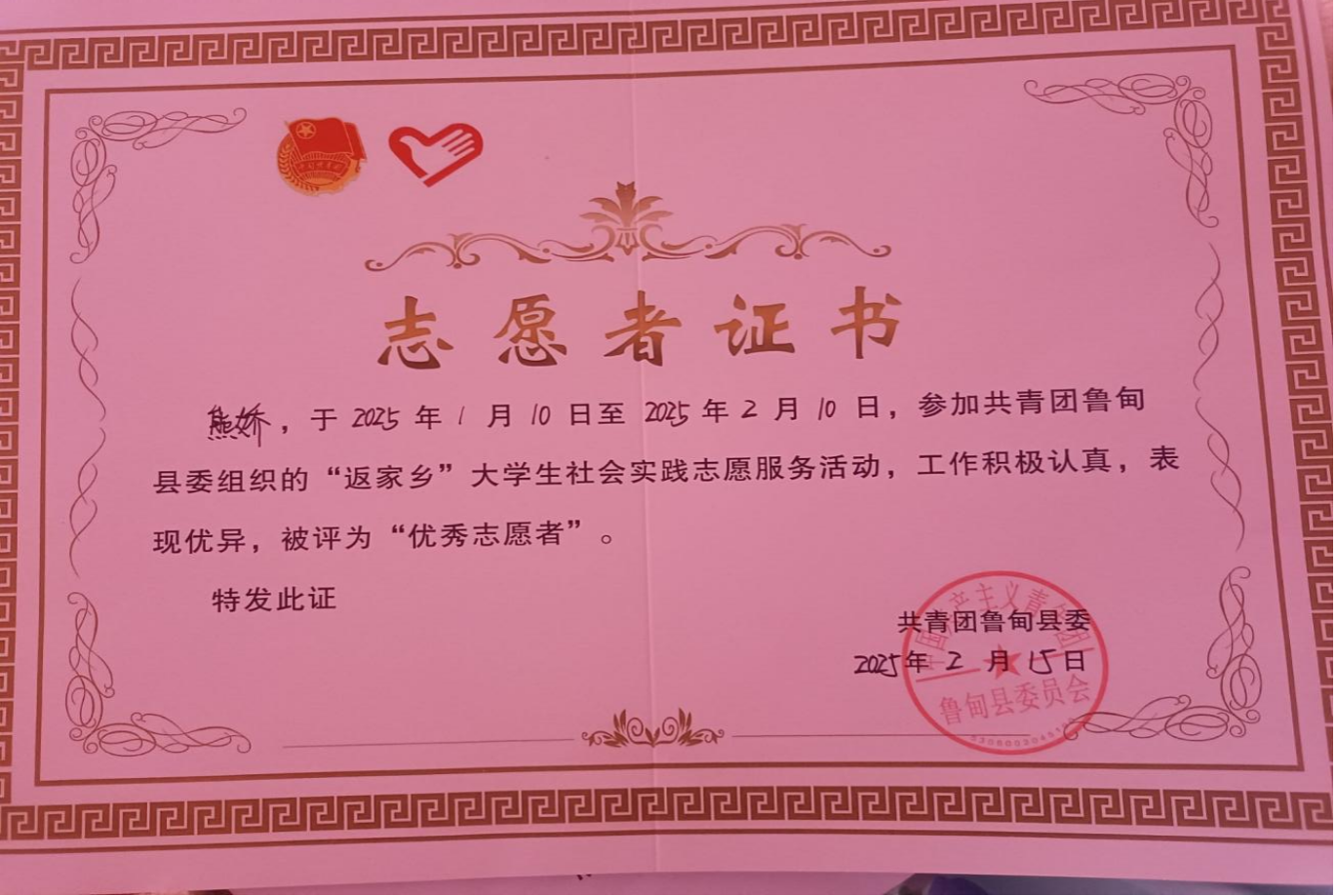 在“返家乡”社会实践活动期间,熊娇参加了鲁甸县龙头山镇组织的乡村振兴活动,每一次登记工作,熊娇都一丝不苟,她深知,看似简单的登记背后,承载着重要的信息记录任务。在志愿者工作中,熊娇总是积极主动,冲在前面。未来,她将坚定不移地朝着目标勇往直前,不断学习新知识,提升自身能力,用实际行动诠释青春的担当与奋斗,努力在未来的人生道路上绽放出更加绚烂的光彩。