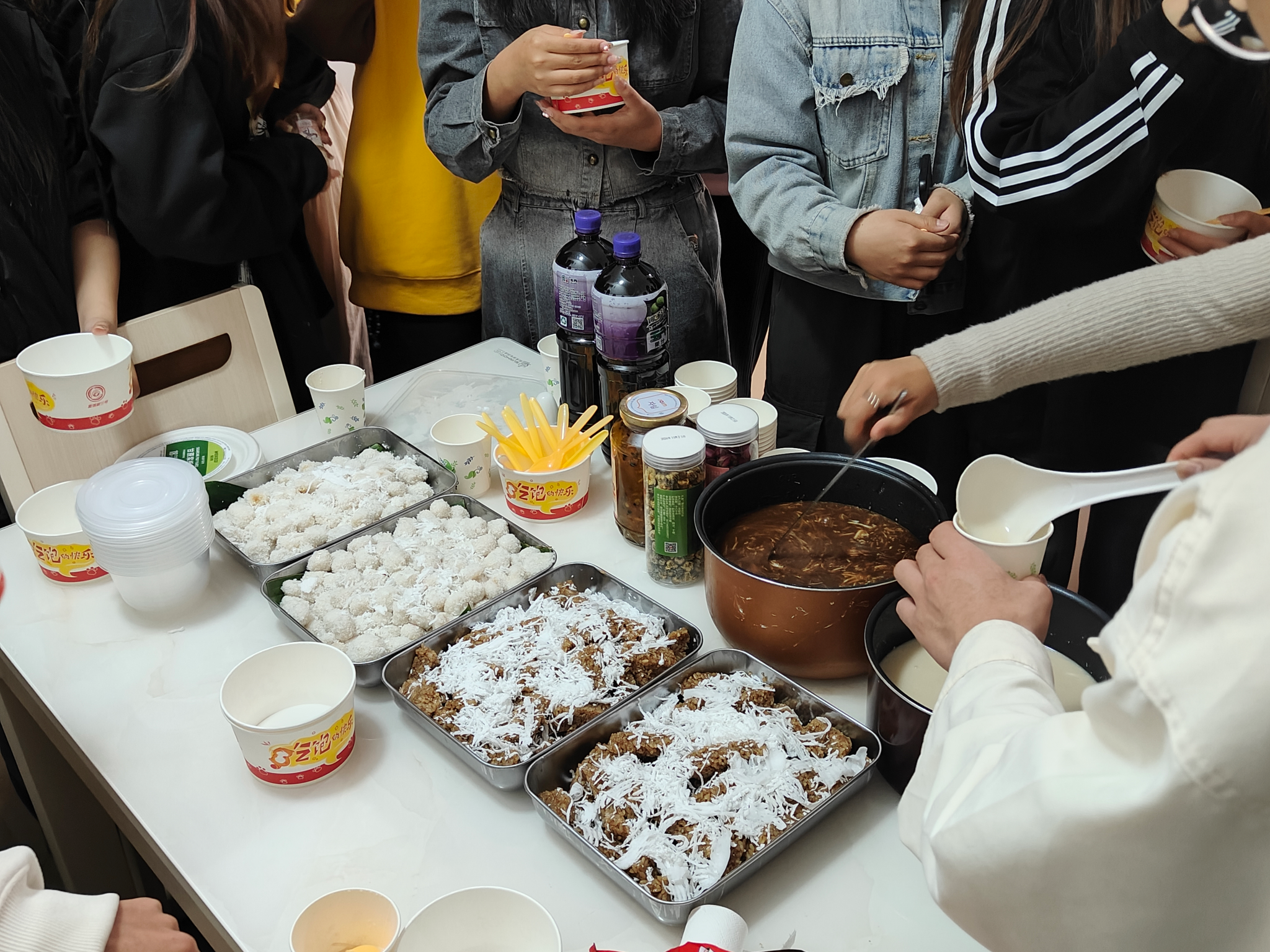 活动上,缅甸外教Thet Yee Aye带领同学们在外教宿舍“大展厨艺”——椰蓉汤圆、小汤圆、黄金糯米饭等泼水节特色传统美食新鲜出炉。Thet Yee Aye老师向同学们讲解美食的制作工艺及其背后蕴含的文化寓意,让同学们深切体会缅甸饮食文化的深厚底蕴。