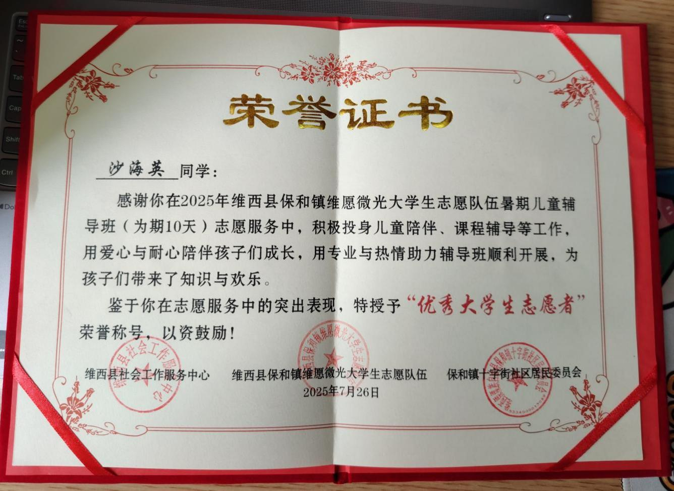 在暑期大学生“返家乡”社会实践活动中,沙海英作为儿童辅导班的志愿者,她用心辅导孩子们的作业,看着孩子们认真地书写,解答着孩子们的各种疑问,她心里满是触动:“虽然每天只陪伴几小时,却在孩子们心里种下了对知识的渴望。他们的眼里藏满对外面世界的好奇,而我们走出去的年轻人,或许就是连接他们与外面广阔天地的‘桥梁’。”