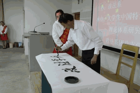 讲座结束后,郭镛教授亲笔为大学生中国特色社会主义理论体系研究会题写“政法学刊”四个字作为研究会的学术专刊刊名,再次祝愿研究会的明天会更好!