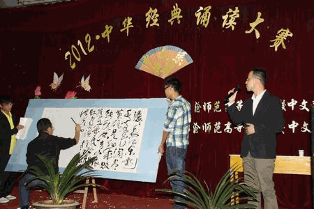 诵读大赛上,中文系副主任刘绍彬老师及中文系团总支书记郭亮亮老师进行了书法与朗诵合作。古色古香的背景中,刘老师在郭老师声情并茂的《兰亭集序》朗诵下,笔走游龙,一幅《滚滚长江东逝水》一气呵成,台下的同学不时爆发出激烈的掌声。