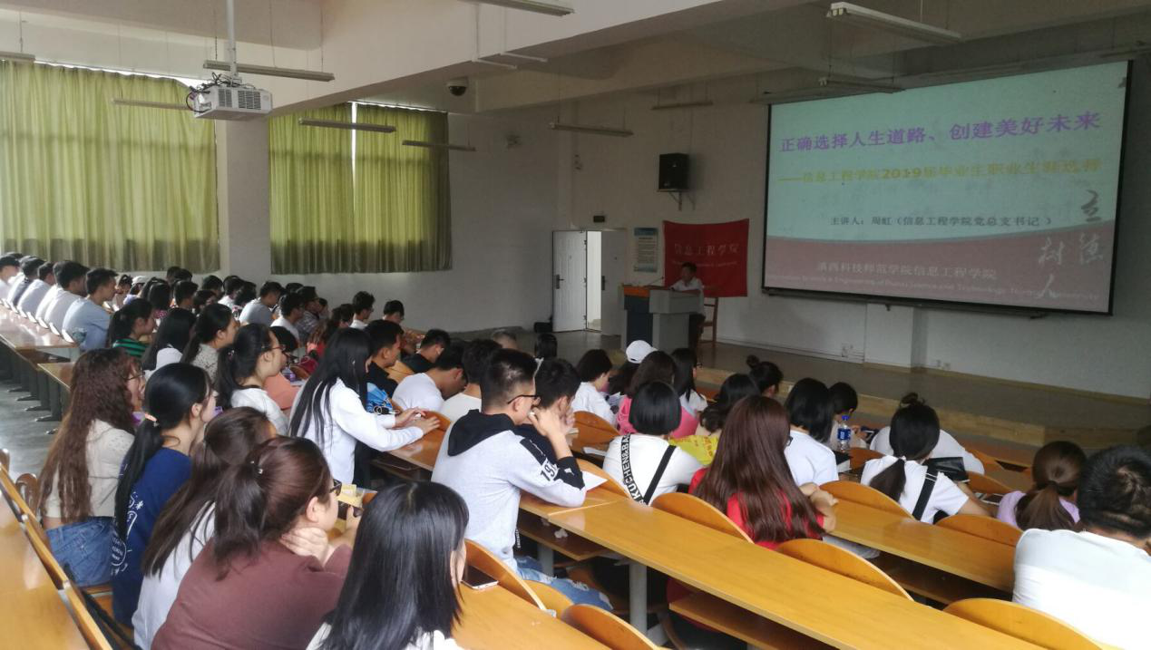 5月14日下午,信息工程学院举办2019届毕业生就业指导讲座,由党总支书记周虹主讲,讲座主题是“正确选择人生道路,创建美好未来”,2019届全体毕业生参加了讲座。