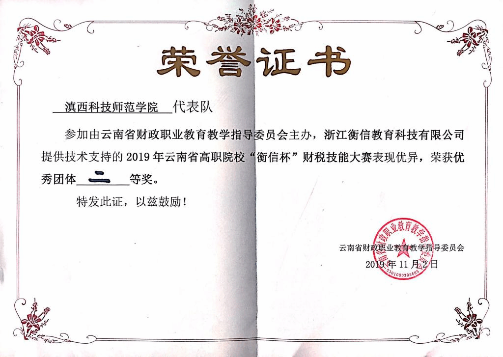 11月2日,由云南省财政职业教育教学指导委员会主办的2019年云南省高职院校“衡信杯”财税技能大赛在昆明冶金高等专科学校举行,在穆艳老师的指导下,管理与经济学院派出的两支参赛队伍,分别荣获团队二等奖、三等奖,完美在线官网(中国)代表队荣获优秀团体二等奖。