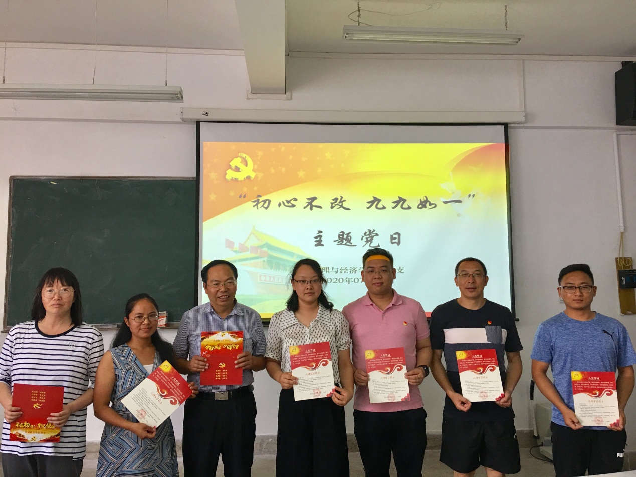 在中国共产党成立99周年之际,管经学院党总支7月1日下午组织开展主题为“初心不改九九如一”七一特别主题党日活动,表达对党生日的美好祝愿。活动共同观看了高校党组织战“疫”示范微党课·“七一特别节目”《党旗飘扬筑牢红色防火墙》,为7名教师党员过政治生日,共同高唱歌曲《我和我的祖国》,并重温入党誓词。