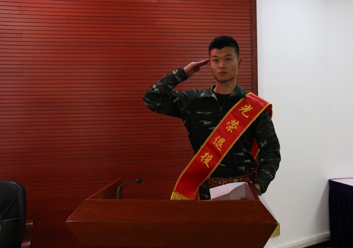 退役大学生代表结合自己的军旅生涯和返校后的学习生活作表态发言,将传承和发扬部队作风,严格遵守学校规章制度,继续在学校发光发热。
