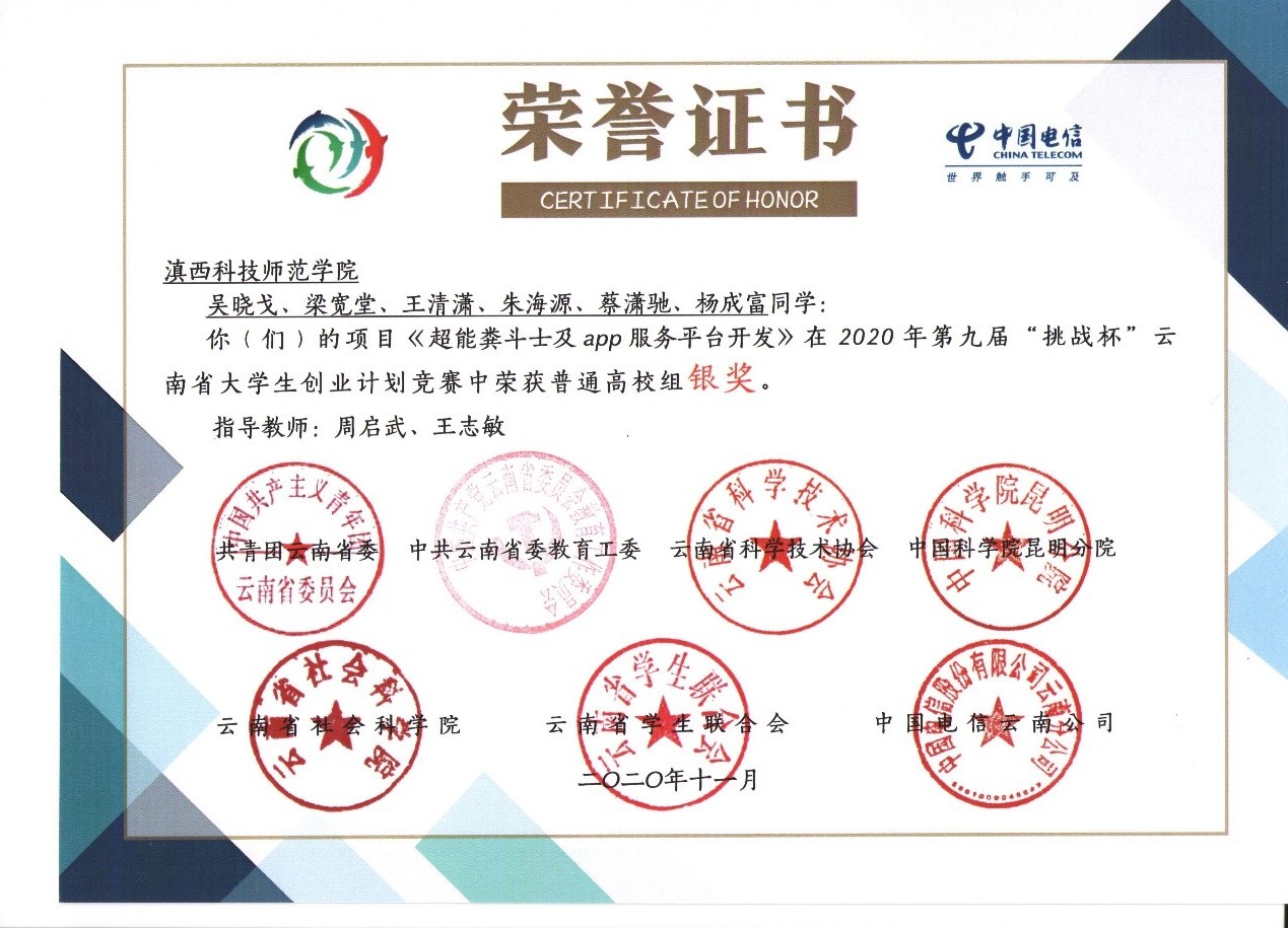 近日,第九届“挑战杯”云南省大学生创业计划竞赛顺利结束,经过大赛组委会专家初步打分、线下评审、线上答辩等环节对各个作品进行评审,完美在线官网(中国)选送的15个作品在省赛总决赛中,斩获银奖2个、铜奖8个、优秀奖5个。