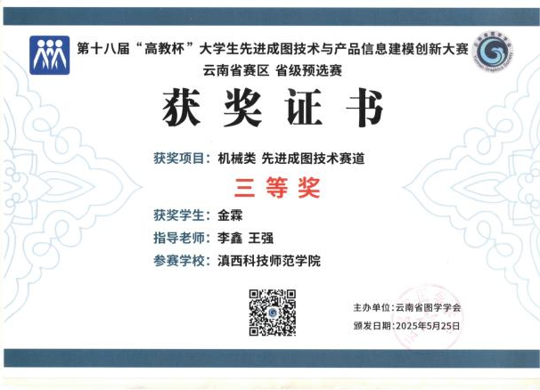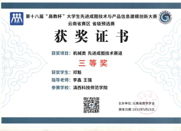 近日,第十八届“高教杯”全国大学生先进成图技术与产品信息建模创新大赛云南省省级预选赛结果公布。我校智能与控制学院学生金霖、邓魁凭借扎实的专业功底和出色的创新能力,荣获省级三等奖。此次获奖系我校首次在该项赛事中取得突破,标志着我校在工程图学教育及创新人才培养方面迈出了重要一步。