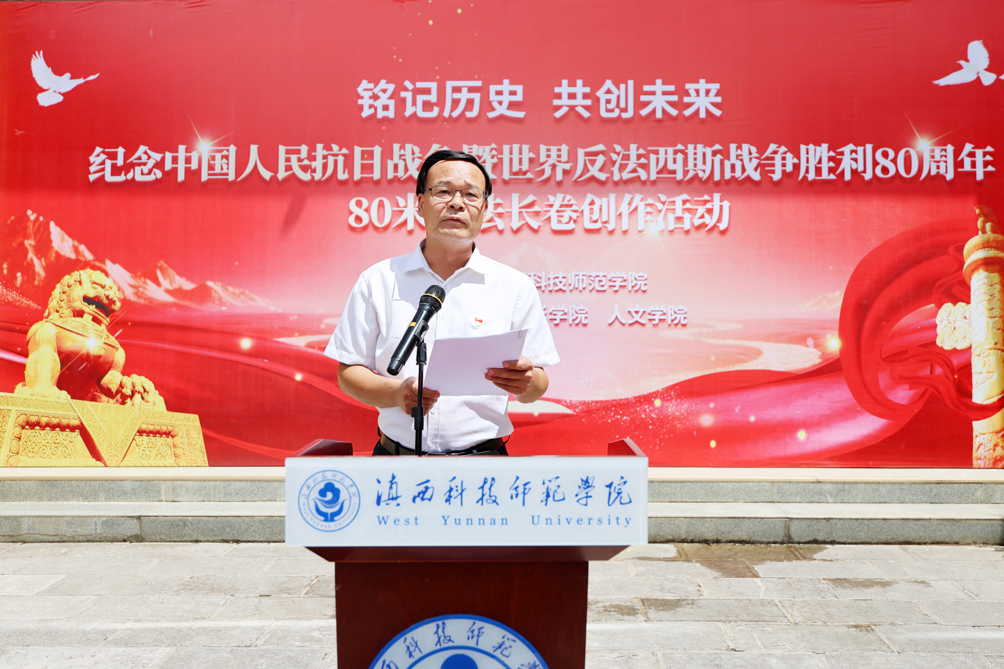 阮凤斌强调,学校始终坚持“为党育人、为国育才”的初心使命,将服务国家战略、守护边疆稳定作为办学治校的重要责任。80米长卷象征着80年峥嵘岁月,每一笔都承载着对历史的敬畏与对未来的期许。此次80米书法长卷创作活动既是对革命先烈的崇高致敬,更是一堂生动的“大思政课”,旨在引导师生在笔墨流转间感受历史厚重、体悟爱国情怀,将抗战精神转化为勤学苦读、建设边疆、报效祖国的实际行动。