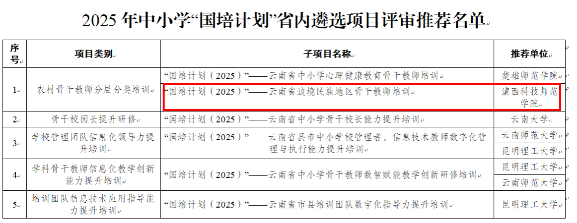 近日,云南省教育厅发布2025年中小学“国培计划”省内遴选项目评审推荐结果公示,我校成功获批“‘国培计划(2025)’——云南省边境民族地区骨干教师培训”项目承训单位。至此,我校已累计获2025年“国培计划”项目三项。