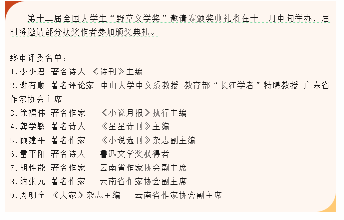 近日,我校人文学院2024级汉语言文学专业学生刘馨雨拟获第十二届全国大学生“野草文学奖”邀请赛小说组“优秀奖”。