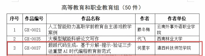 近日,云南省教育厅公示“教师人工智能应用案例征集活动”评审推荐结果,我校智能与控制学院青年教师何星宇的“超越代码生成:基于分解-提示-验证三步法重塑AI时代编程教育新范式”教学案例成功入选,推荐参加教育部教育技术与资源发展中心教师人工智能应用案例征集活动。
