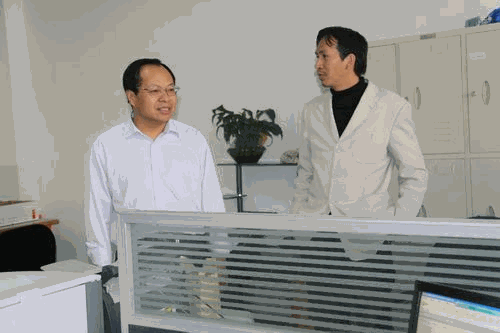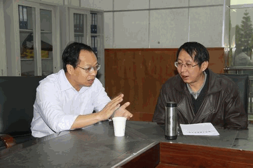 董副校长(左)在数理系办公室,向系党总支书记王东云(右)询问情况,并指示