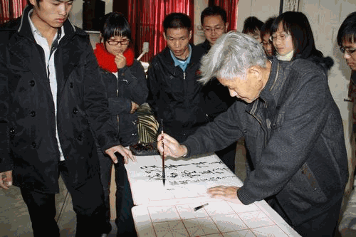 教室里墨香四溢,姚先生给同学们表演书法,同学们捧着姚先生为其题写的字如获至宝。