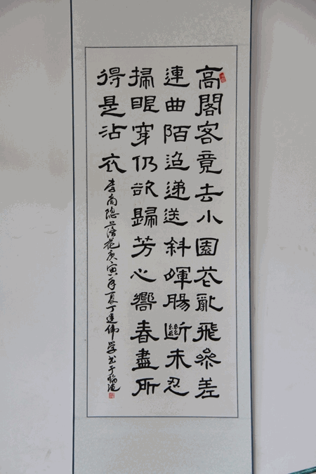 四名同学中,詹能年龄最大,生于1987年,今年6月份刚刚毕业。李峰、黄建平和丁建伟均生于1988年,正就读于临沧师专中文系。在本次展览中,四名同学的作品囊括了行书、草书、隶书、篆书、硬笔书法五种形式。詹能擅长行书,行书一幅《春江花月夜》,其运笔流畅、刚柔相济、点画凝练简洁。李峰以篆书见长,他书写的一幅甲骨文作品,带你坐上时光机,回到密林狩猎的原始年代。以隶书作的“腾飞”二字,以繁体的形式呈现,“腾”字里的“马”字部分,如一只驰骋的骏马,“飞”字的右下角如一只翱翔天宇的翅膀,“腾飞”二字以左上、右下的方阵排列,整幅作品很有张力,给人腾空、飞翔的视觉感受。丁建伟隶书写得不错,擅临摹,临摹曹全碑较多,以隶书作李商隐的《落花》一幅,其文字清晰,结构舒展,字体秀美飞动。黄建平,喜欢寄情书法,随性而作,一幅作品中可见多种书法形式的影子,自成一体,他的六幅作品就是一个例证,硬笔行书中有隶味,毛笔行书中有草味……