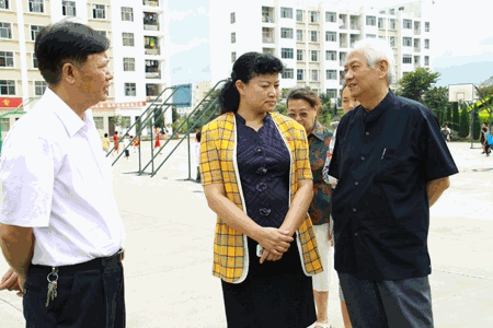 上图为清华大学建筑学院高冀生教授(右一),省教育厅正厅级巡视员郭玉鉴(左一),和临沧师专校长那金华(左二)参观校园并交流建设心得