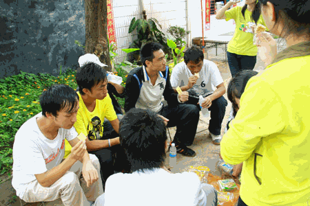 这群同学来自08级茶学班,他们正在进行的“抓土”动作,其实是茶学术语中的“装营养袋”,是扦插茶树枝条短穗的其中一个步骤。他们所包围的这堆土,便是培育茶苗所用,被装入营养袋的土,装土所用的营养袋系塑料薄膜材质,8cm×12cm的规格。
