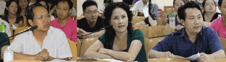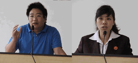 本次比赛评委团成员11名,学校党委书记谢昌浩教授、校长那金华教授、副书记赵庆明、副校长董大校教授、纪委书记双春仁五名校领导出任评委,另六名均是来自学校系、部、处的教学精英。在选手20分钟的说课后,评委团成员对选手提问,仿真将要到来的合格师专评估专家组们的提问。在本次说课比赛中,评委团成员们的提问犀利、细化,直指选手说课的弱点、盲点,有时带有点质疑的味道。如,工学交替的“工”如何安排?举实例说明,心理学专业的教师们在服务学校师生方面具体做了哪些工作?如此强的理论性怎么让学生学有兴趣、学有成效?评委团的提问,目的在于帮助教师严谨说课的思维,进一步优化说课的内容。除了提问,评委团还提了大量的建议。如,《思想道德修养》课程可贯穿于学生学习生活的方方面面,要想方设法多开辟一些新颖、又贴近学生实际的教育载体。设计法律内容课件的装饰图标,可更换为象征法律公平性的天平。