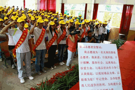 由领誓人领誓,临沧师专300名参加启动仪式的大学生禁毒志愿者,全体起立,庄严宣誓:我志愿成为一名光荣的禁毒志愿者,我承诺,尽我所能,不计报酬,服务社会,远离毒品,珍爱生命,与毒品坚决作斗争!从我做起,以抵制毒品为荣,以贩毒为耻!牢记使命,为夺取禁毒人民战争的胜利,为构建社会主义和谐社会而贡献力量!