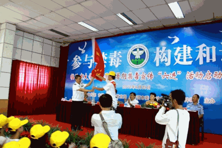 临沧市禁毒委副主任、市公安局副局长梅盛斌向大学生志愿者禁毒宣传分队授旗,接旗的同学将旗帜挥舞展开。郭金富书记宣布活动启动。届时,临沧师专将组织同学们拉开暑期禁毒宣传的大幕。