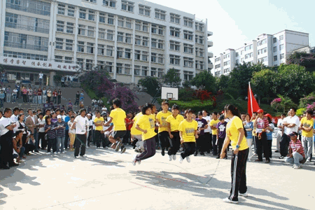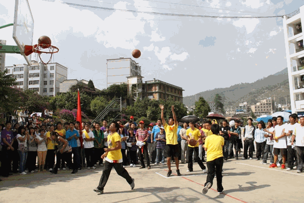 赛场上,激烈竞争着,也妙趣横生着,抱腹笑、紧张地呐喊、慌乱地纠正失误、胜利的喜悦、失败的安慰……参赛队员、加油助威团员,点点汗水、张张笑脸,好一个临沧师专初夏阳光灿烂的早晨。