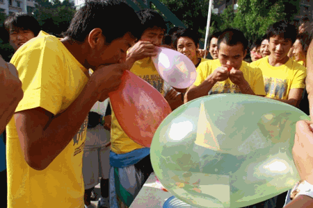 23日上午9时,趣味竞技运动会在临沧师专中心篮球场拉开战幕,来自临沧市各单位团体的18支代表队参战。运动会共有七大趣味比赛项目,“巨人之屐”,用两条长木板特制出一双大鞋,可供四个人前后排列同时穿着,故取名“巨人之屐”,小组成员穿着该鞋,最先接力走完赛段的为赢家。“拿你出气”,五名小组成员同时用嘴吹气球,在3分钟之内,吹爆最多气球数的为赢家。“蜻蜓点水”,两名小组成员摇绳,八名成员同时跳绳,1分钟半的时间里,跳绳次数最多的为赢家。“谁是姚明”,五名小组成员依次投篮,1分钟半的时间里,进球数最多的小组为赢家。“咱们青年(工人)有力量”,10名小组成员,在20米的距离间,共同运送若干沙袋,运完用时最短的小组为赢家。“楚河汉界”,就是众所周知的“拔河”。