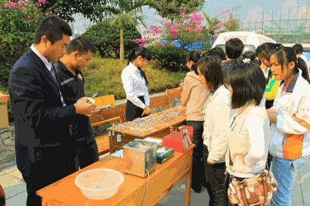 云南大全眼镜公司此行由公司副董事长周哲带队,携验光师及其他工作人员共8人前来,公司市场部侯总经理亲自为全校师生提供清洗眼镜的服务,用超声波仪器清洗过的眼镜清晰度、明亮度都大为提高,接过眼镜的同学们都欣喜地发出“好清晰、好明亮”的感叹。侯经理边清洗,还边向同学们传授保护眼镜的小常识,“不要单手摘眼镜。往一个方向擦拭镜片,不要来回擦拭……”同学们在众多的款式前有些不知怎选,公司的小冯,仔细捕捉同学们的外貌信息,以及言行流露出的性格信息,热情地为他们挑选合适的款式。