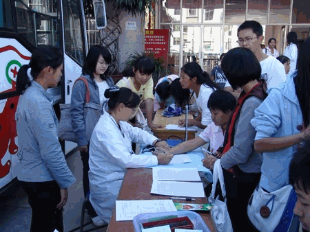 (党委宣传部文/张玉超 图/陈奇云)2009年9月29日,临沧市中心血站的两辆采血车停在我校行政楼前,车旁边搭起的工作台前前来报名献血的师生络绎不绝。