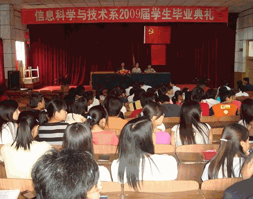 (信息科学与技术系 梅英)2009年6月16日上午10:00,信息科学与技术系在电教阶梯教室举行09届毕业生毕业典礼,那金华校长到会致辞。那校长在向毕业生表示祝贺之余,也就就业问题和同学们交流了自己看法,希望每一个同学尽快找准自己的就业目标,早日就业,并在今后的日子里常回“家”看看。那校长深情款款的话语感动着信息科学与技术系的每一位毕业生,浓浓师生情流淌在会场的每一个角落……紧着着,信息科学与技术系副系主任李燕梅代表信息科学与技术系向毕业生致以了祝贺和祝福,祝愿每一名毕业生在新的人生道路上事业有成、爱情甜蜜、一帆风顺。教师代表施建林、毕业生代表王应敏、在校生代表张翠凤也分别向毕业生送上了他们的祝福。离别的伤感和未来的期盼复杂着毕业生的情感,甚至有人偷偷低下了头抹去了眼角的泪水……