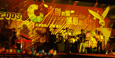 (文/艺体系杨田华 图/马志龙)2009年6月6日晚8点,以“离别的情感恩的心”为主题的艺体系2009年音乐专业毕业生专场演唱会在临沧师专新篮球场隆重登场。专业的演出阵容、极佳的声光效果、火爆的现场气氛,混合着风声、雨声以及师生情、离别意,带给现场的观众无比的震撼与感动,将又一个难忘的夜晚留在了现场所有观众的记忆中。