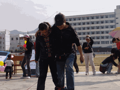 蒙眼贴鼻和插花游戏有异曲同工的效果,参与者被梦上眼睛,要求其手拿象鼻(花),经过一段无视觉的行走后,把鼻(花)贴(插)到象鼻(花盆)上。只见参与者们小心翼翼地迈着步幅,手在半空挥舞,寻找那个可以给自己带来奖票的目标点。运送乒乓球区里拼的是够稳的速度,参与者们需要平抬着置有调皮好动的乒乓球的球拍,在规定时间内绕过三个障碍物到达终点。游戏时常在乒乓球落地和一片叹息的哗然中嘎然止住,但乒乓球的调皮和顽固却激起了参与者们的斗志,时而还是能听得兴高采烈的欢呼声从得胜者口中传出。心有灵犀区里,好友们结伴同行之,通过手舞足蹈的比划和贴切的形容向好友求证心有灵犀的默契度。两人三足区也是好友们喜欢出没之地,被捆绑在一起的两只脚在顺利的行进过程中昭示着两人的友谊和默契。行进呼啦圈区里,呼啦圈高手们把高超的呼啦技艺和走步结合在一起,提升难度系数,向技艺要极限。袋鼠跳区,两只被套在麻袋里的“袋鼠”奋力向前蹦跳着,都想像刘翔一样,做第一个碰到终点红丝带的飞人。跳绳区和投篮区属于比较常规的游戏区,想要曼妙身材和健康体魄的人们在这里还能额外赢得奖票,惊喜连连。抛圈套物区,逆“不把自己的思想强加于人”的理念而行,能把竹圈套到无辜的啤酒瓶上,你就是赢家。