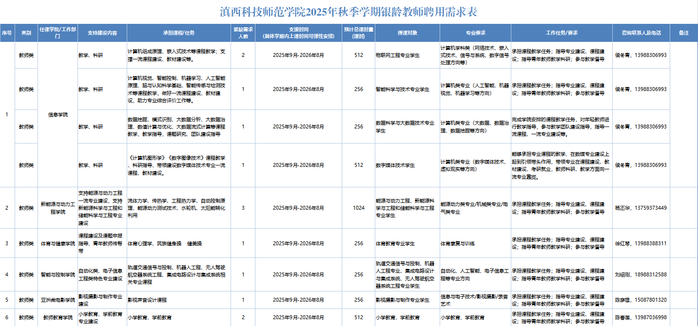 岗位需求如下图所示,详见《完美在线官网(中国)2025年秋季学期银龄教师聘用需求汇总表》(附件1)。