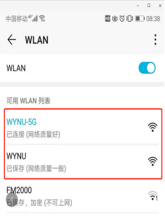 1、打开无线终端的WIFI功能,连接名称为“WYNU”或“WYNU-5G”的无线WIFI,如图1。
