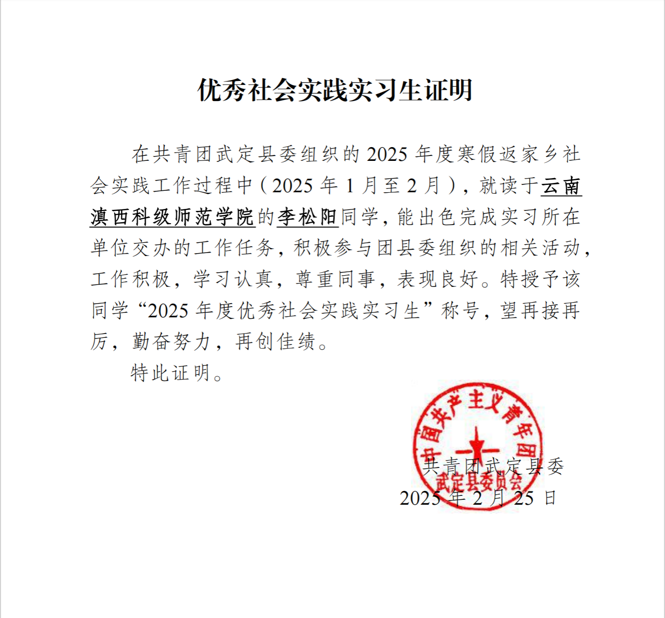 李松阳来到楚雄州武定县中国共产党武定县委办公室,主要负责分发文件,布置会场等。李松阳表示,在社会实践活动期间收获了许多宝贵的经验和深刻的感悟,无论工作的内容多么基础,只要用心去做,都能从中汲取到丰富的经验和成长的力量。这些收获将对他今后的学习和工作产生积极而深远的影响,同时也让他对自己未来的职业发展有了更清晰的方向和更坚定的信心。