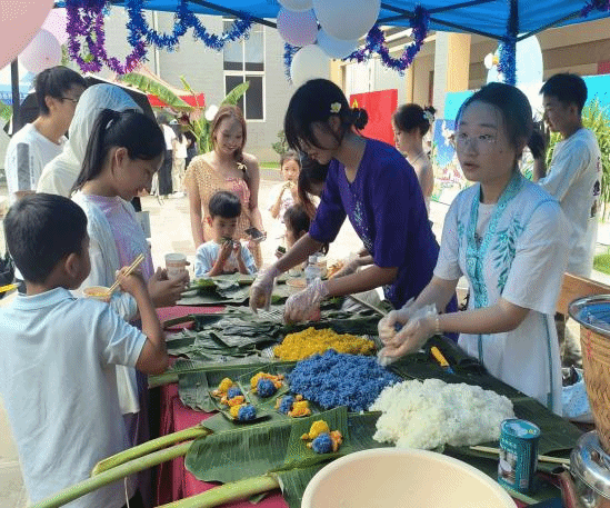 国际教育学院的缅甸语、泰语、老挝语等专业师生与来自缅甸、柬埔寨的留学生、外教合作,打造出风格各异的文化展区。同学们身着缅甸笼基、泰国纱笼等服饰,向参观者介绍来自东南亚国家的手工艺品;“美食交流坊”和“手工艺研习角”,师生们用外语与留学生沟通,学习制作鱼汤米线、鸡蛋沙拉、东南亚咖啡、斑斓糕、芒果糯米饭等美食,在烹饪过程中了解东南亚饮食文化。