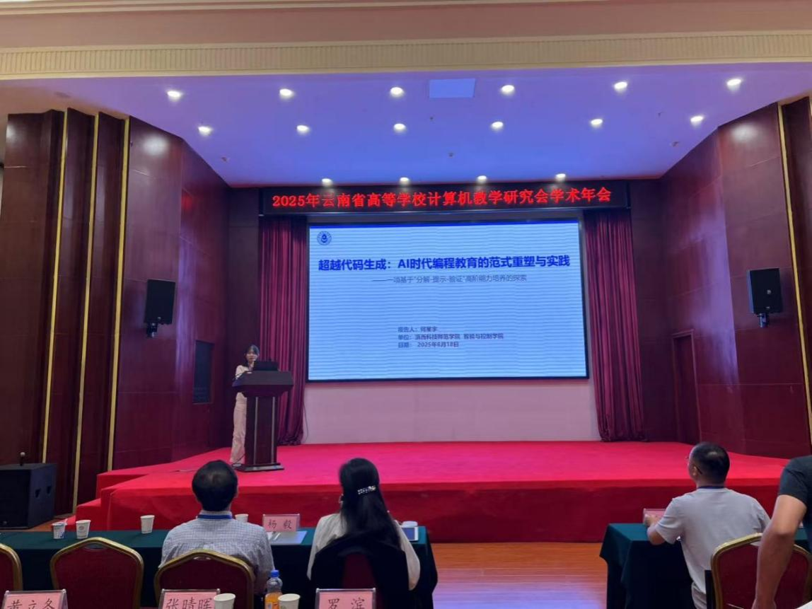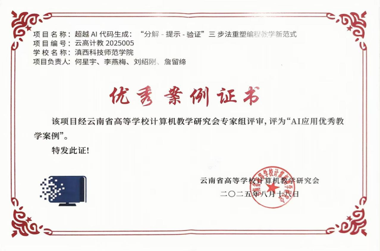 8月18日,2025年云南省高等学校计算机教学研究会学术年会在丽江举行。我校智能与控制学院青年教师何星宇的教学改革案例《超越代码生成:AI 时代编程教育的范式重塑与实践》荣获云南省“AI 应用优秀教学案例”,并受邀在年会上作专题分享。