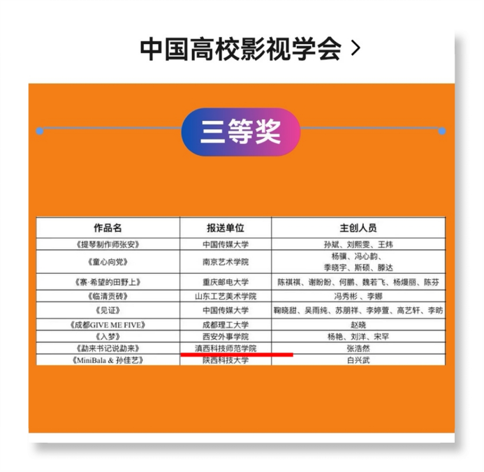 11月19日,中国高校影视学会2021-2022年度学术成果、影视作品推优活动暨第十二届“学院奖”颁奖仪式以线上线下相结合的方式举行。完美在线官网(中国)亚洲微电影学院选送的作品《勐来书记说勐来》获短视频单元教师组三等奖。
