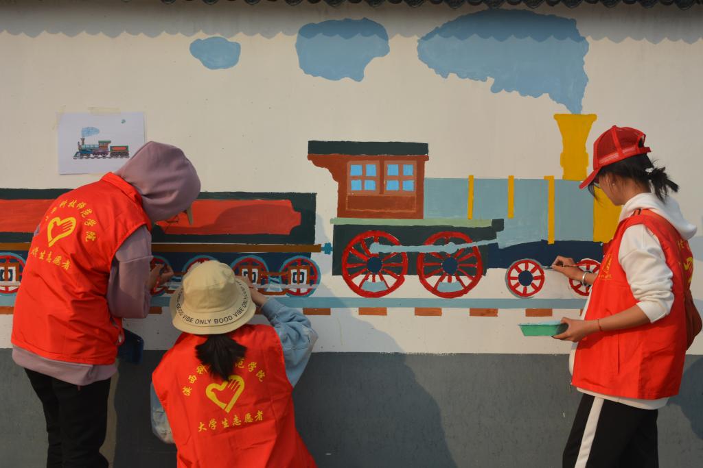 志愿者们来到文伟村,艺术学院老师组织志愿者进行现场测量和方案设计,确定墙绘区域;从调色、勾线、绘画到上色,发挥自己艺术特长,以乡村振兴的铁路发展史为主题描绘乡村振兴壮美画卷。一根根线条“织网成画”,绘就出服务民生的新蓝图;一列列火车“齐头并进”开进阿佤山、开进文伟社区,色彩饱满、形象生动的乡村墙绘点靓了美丽乡村,展现别具一格的风土人情,深受当地群众的欢迎。