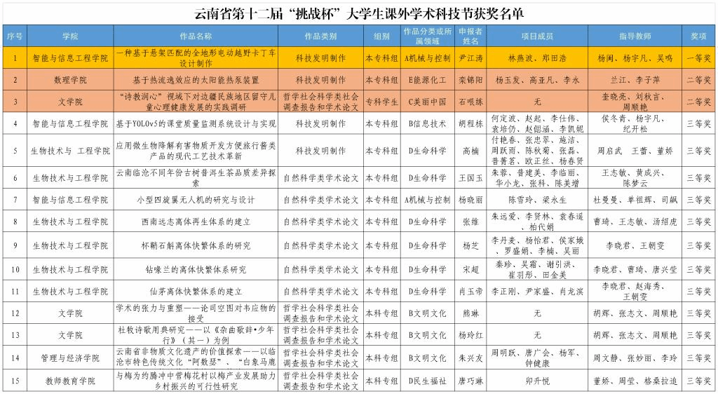 6月6日,云南省第十二届“挑战杯”大学生课外学术科技节在昆明落下帷幕,我校选送的15项参赛作品,经过激烈角逐,共荣获一等奖1项,二等奖2项,三等奖12项。