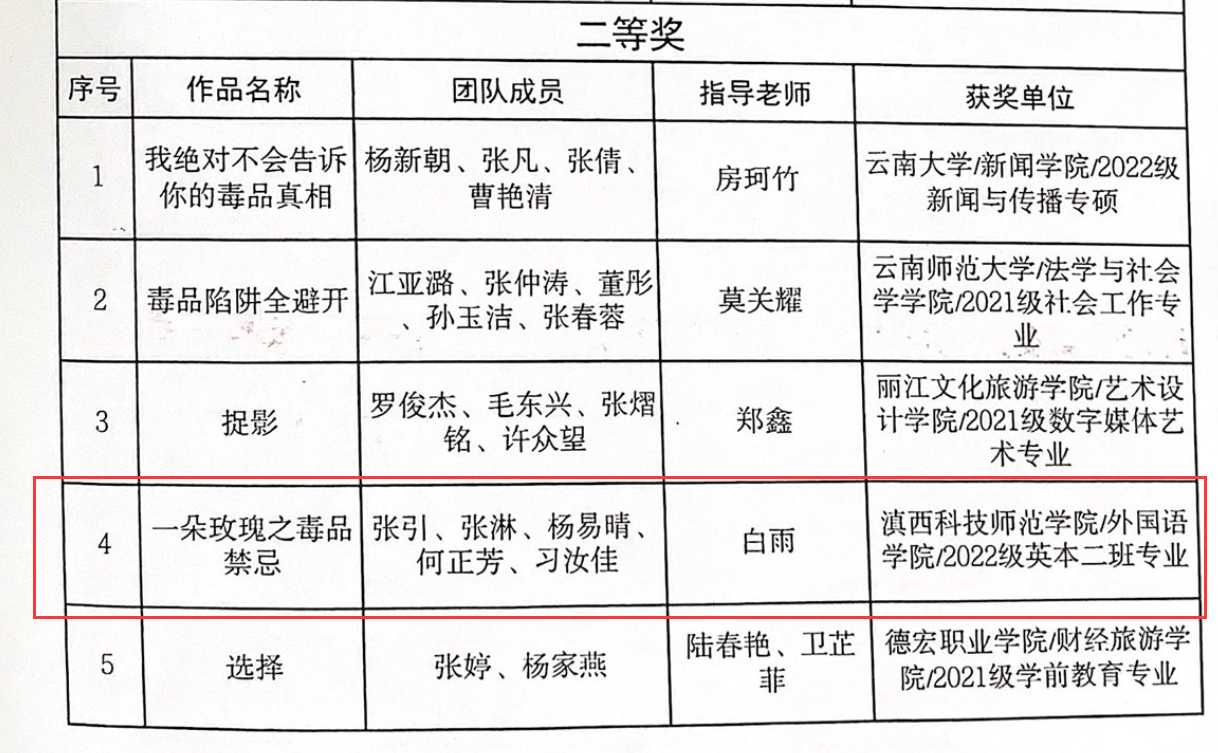 近日,由云南省禁毒委员会办公室、云南省教育厅、共青团云南省委联合举办的第36个国际禁毒日禁毒微视频作品征集活动落下帷幕。本次活动中,我校学子取得了荣获二等奖一项、三等奖一项、优秀奖一项。
